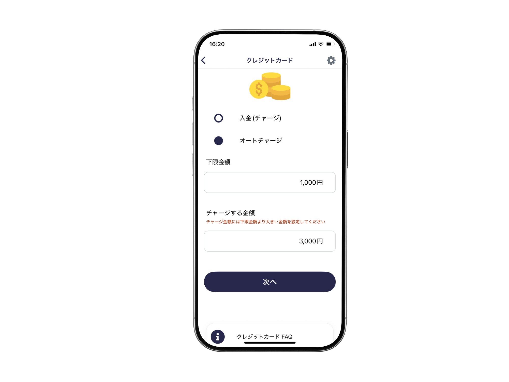 あります。下限金額をご自身で設定していただき、その残高を下回ると設定額が入金(チャージ)されます。