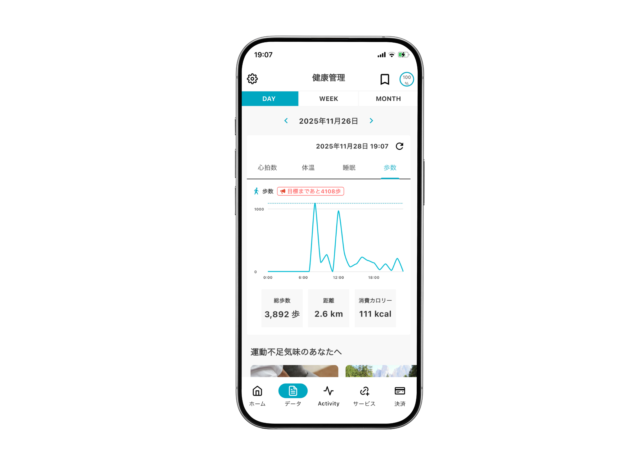 睡眠・歩数・心拍・体温の4種類を日/週/月単位でご確認いただけます。