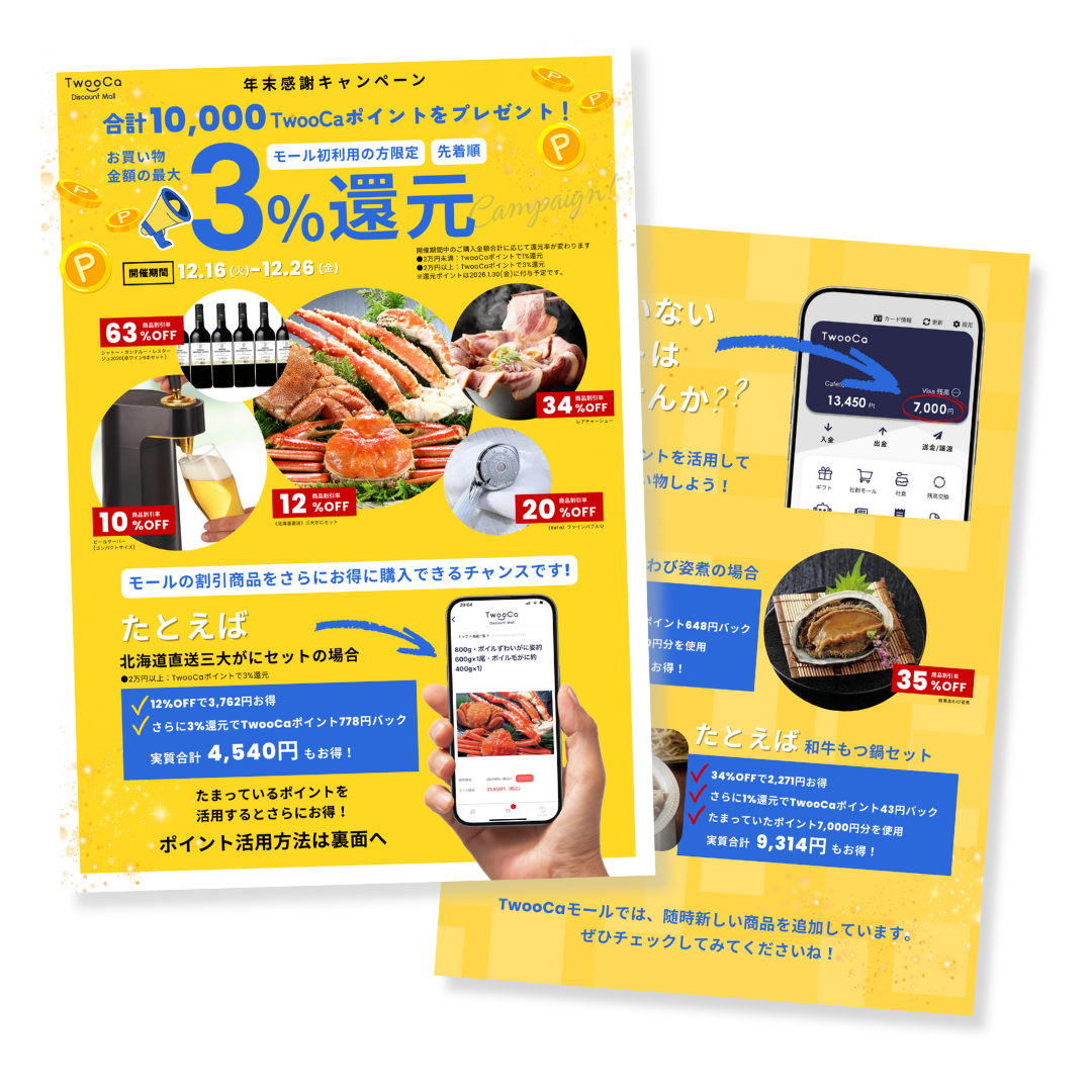 ・特典:期間中にTwooCa Mallでのご購入金額に応じて、先着順で最大3%ポイント還元いたします。